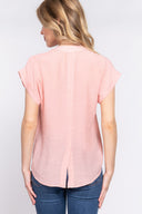 Add a touch of elegance to your wardrobe with our Dolman Sleeve Open Neck with Front Pocket Button Down Woven Top in Pink. Add it to your cart now and experience the perfect blend of fashion and comfort!