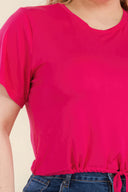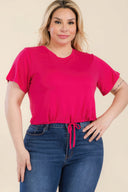 Upgrade your casual wardrobe with the Plus Size Tie Front Drawstring Short Sleeve Crop Top in Fuchsia. Add it to your cart now and experience the perfect blend of fashion and comfort!