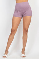Casual shorts in a matching solid color with a high-rise waist and elasticized waistband for a comfortable fit. The mini length adds a playful vibe, making them perfect for casual outings or lounging at home.