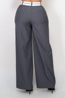 Crafted from a soft, breathable blend of 78% polyester, 18% rayon, and 4% spandex, these pants provide the perfect balance of structure and stretch for all-day comfort. Featuring a wide-leg silhouette with a flattering high-rise double waistband, these pants create a sleek and elongated look. Available in an elegant charcoal hue, they are ideal for mixing and matching with various tops and accessories. Offered in sizes S, M, and L, they ensure a tailored fit for different body types. Pleated details add a refined touch, while the double waistband, belt loops, and pockets enhance functionality. The front zipper and hook closure complete the polished design.